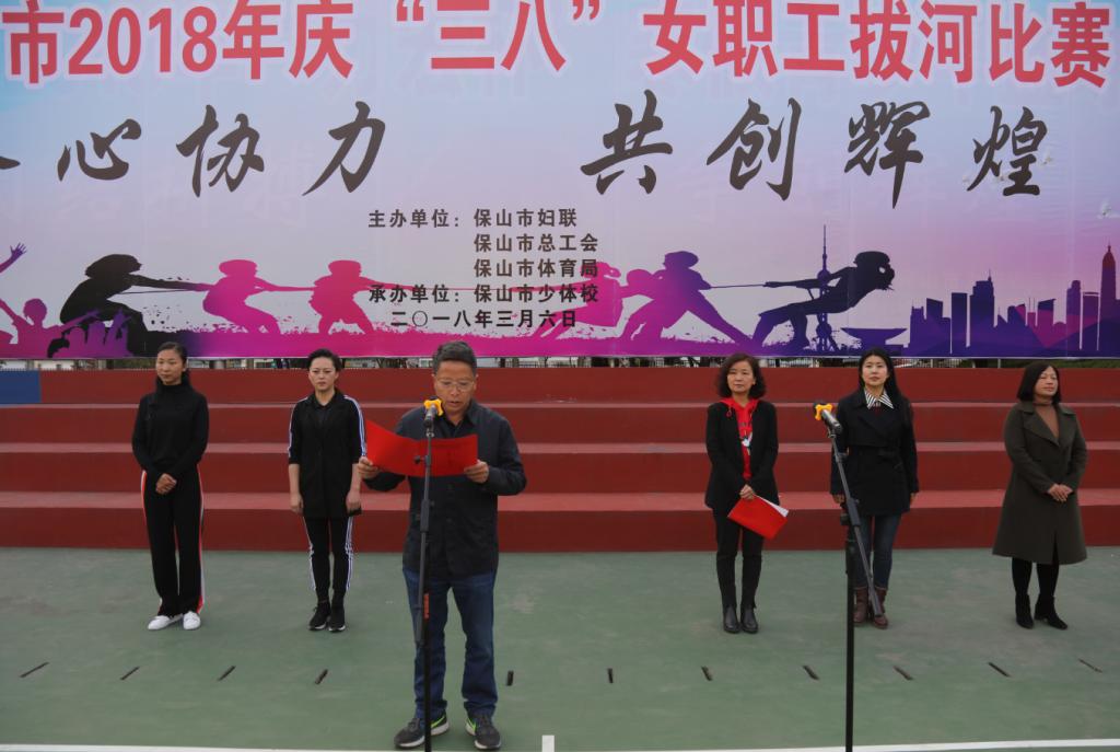 春暖花开,万象更新。在全市上下深入学习宣传贯彻党的十九大、省委十届四次全会、市委四届四次全会精神,全面推进保山跨越发展的关键时刻,我们迎来了第108个“三·八”国际妇女劳动节。3月6日,由博365体育在线、市妇联、市体育局联合举办的女职工拔河比赛在市体育场篮球场隆重开幕,来自全市各行各业的妇女代表欢聚一堂,庆祝属于自己的节日。市人大常委会副主任、市总工会主席李元标出席开幕式并致词向全市广大妇女、女职工致以节日的问候。市总工会、市妇联、市体育局等相关领导出席了开幕式。